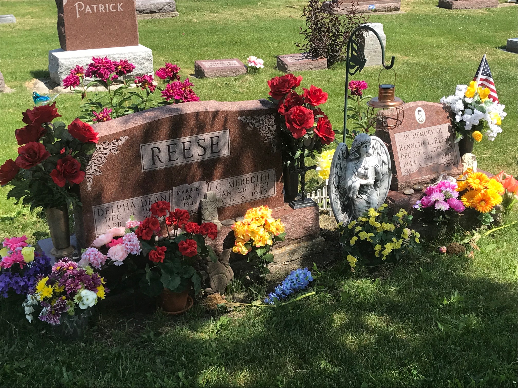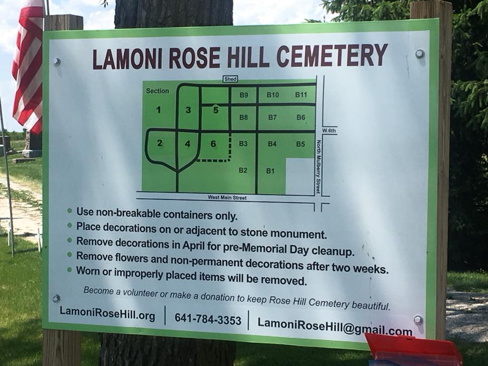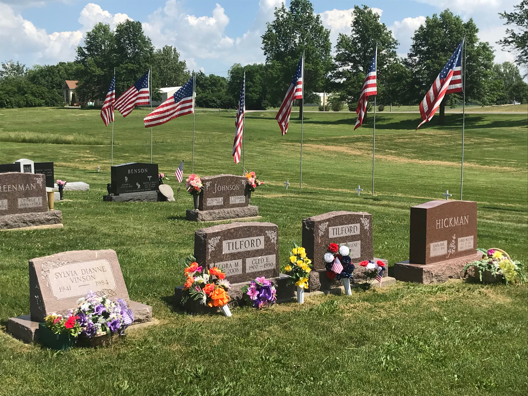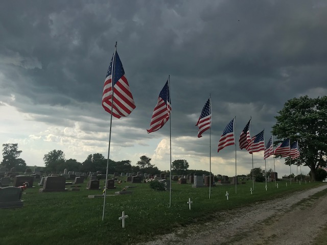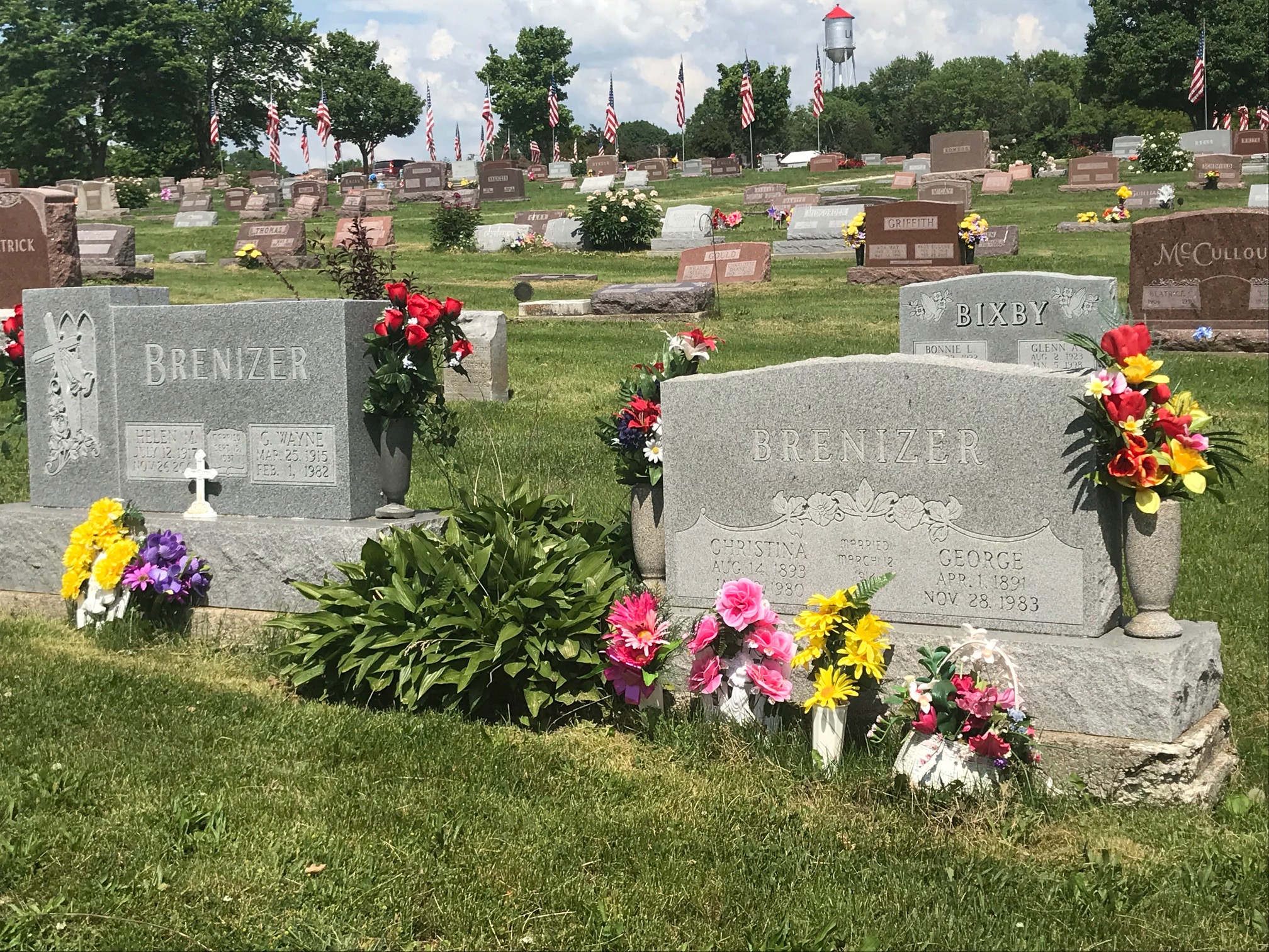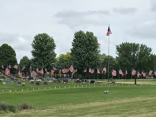 A collection of photos, to show some of the decorated memorials and flags at Lamoni Rose Hill.