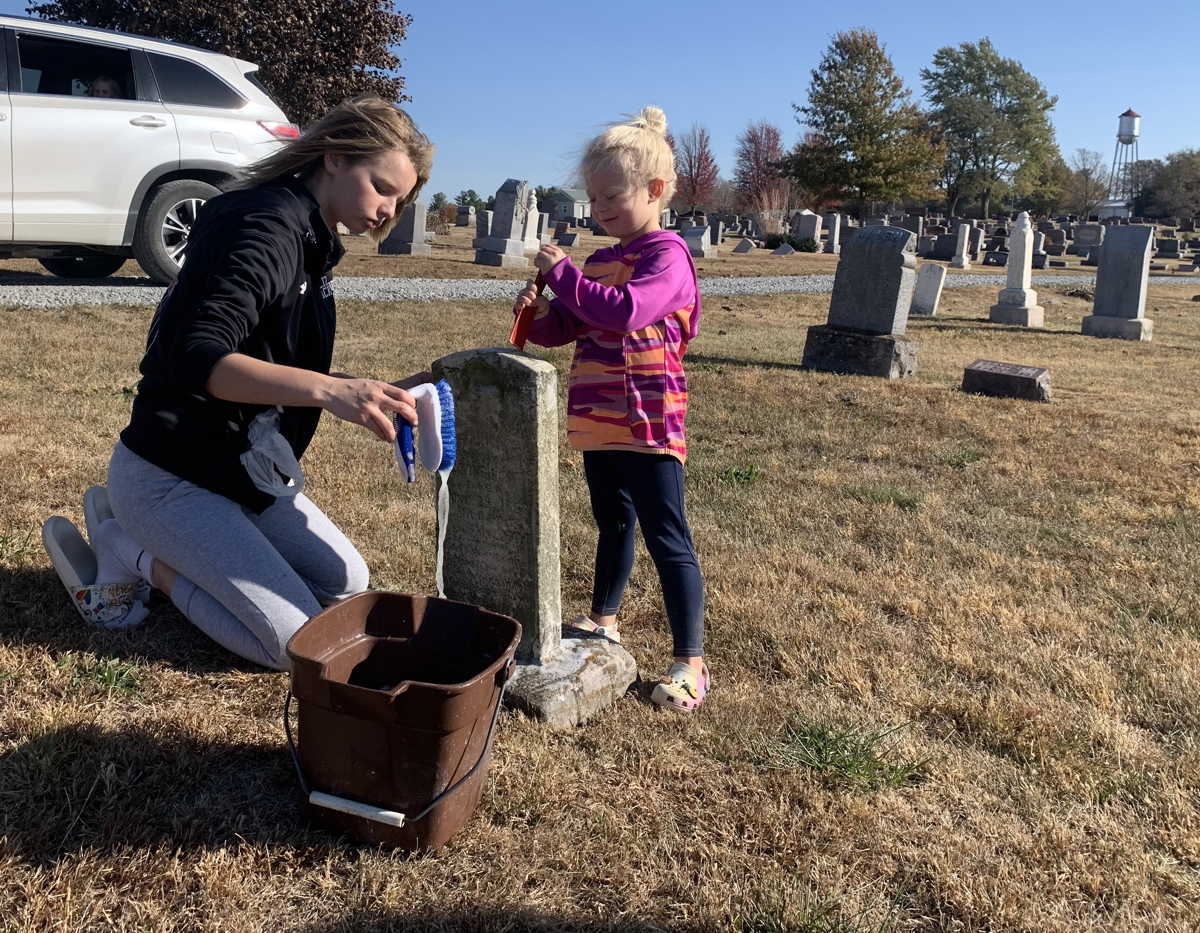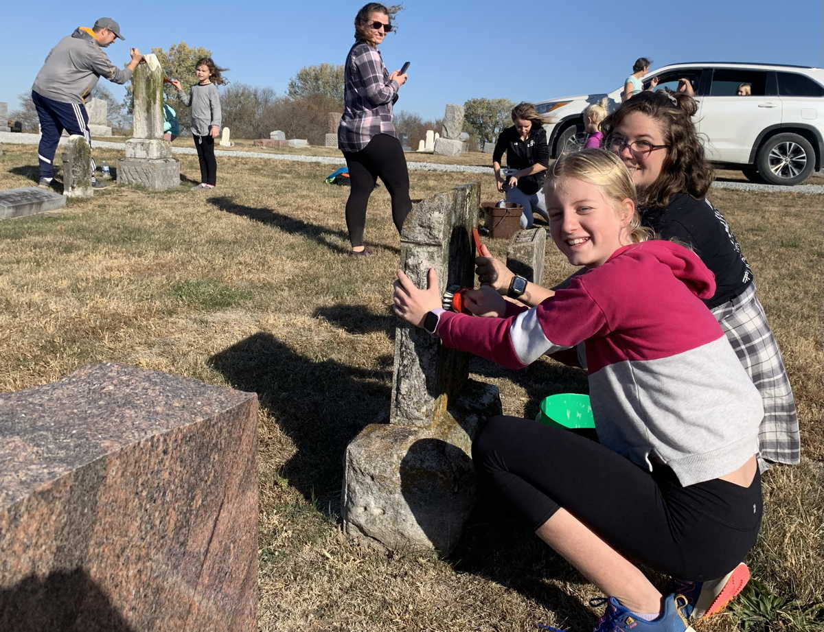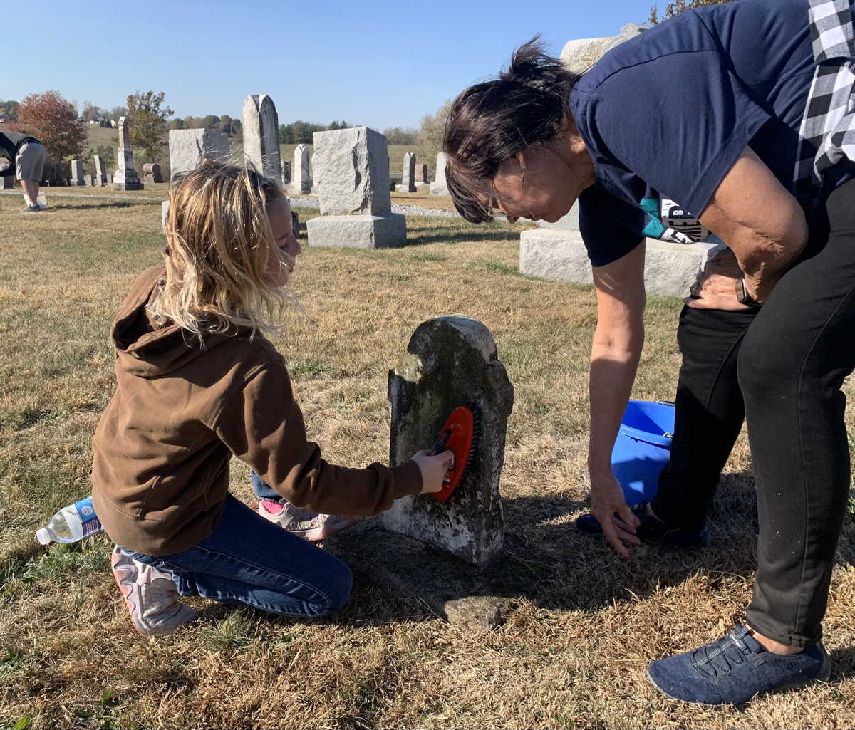 A group of 10 kids and 6 adults from the Methodist Church came to help with other tasks under the direction of Board Secretary and Sexton Jim Jones. In the first hour they swept through the cemetery to clear it of ground decorations and debris, filling 6 large industrial strength lawn and leaf bags. They spent the rest of the morning cleaning the oldest headstones to scrape away moss and scrub them with soapy water. At least 35 headstones were cleaned.