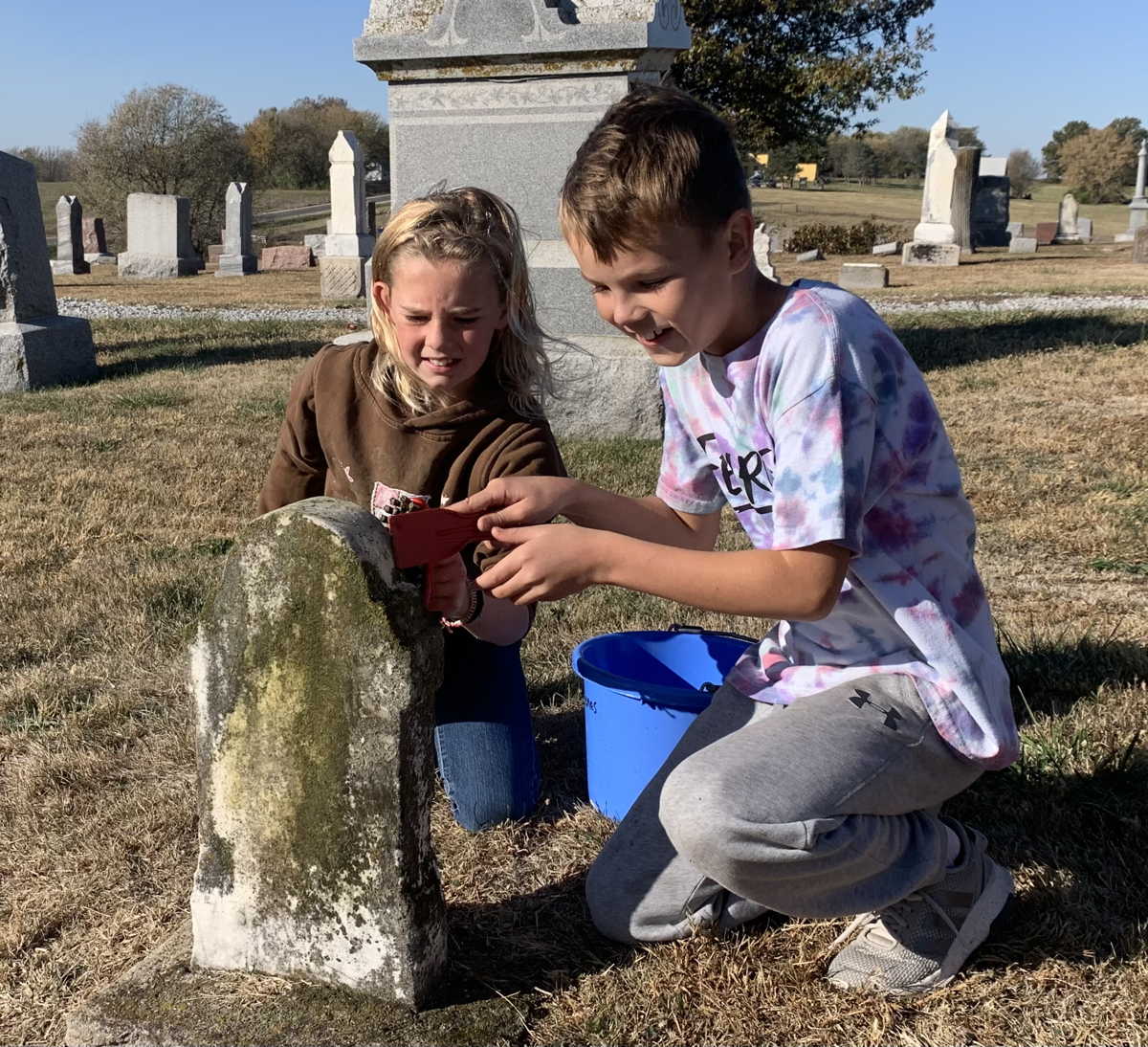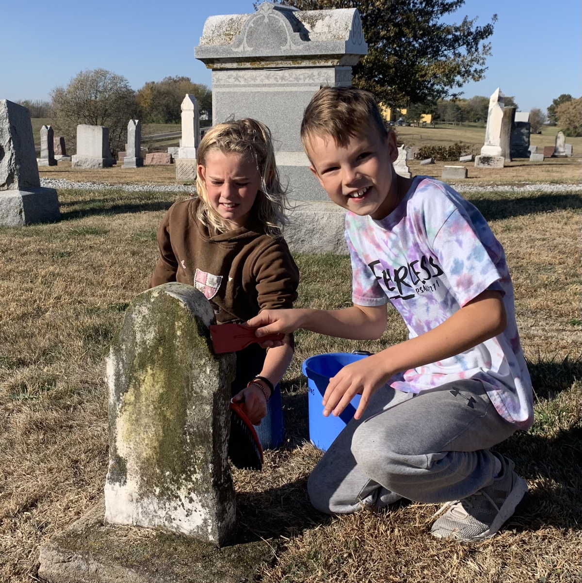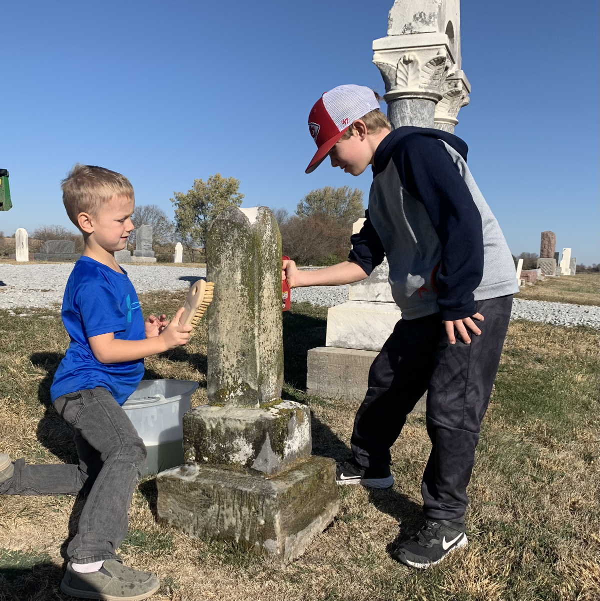 A group of 10 kids and 6 adults from the Methodist Church came to help with other tasks under the direction of Board Secretary and Sexton Jim Jones. In the first hour they swept through the cemetery to clear it of ground decorations and debris, filling 6 large industrial strength lawn and leaf bags. They spent the rest of the morning cleaning the oldest headstones to scrape away moss and scrub them with soapy water. At least 35 headstones were cleaned.